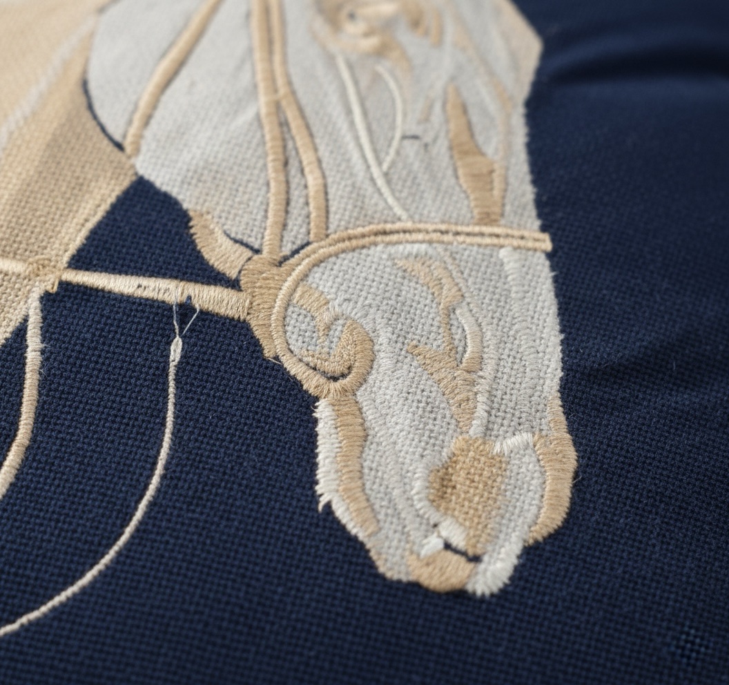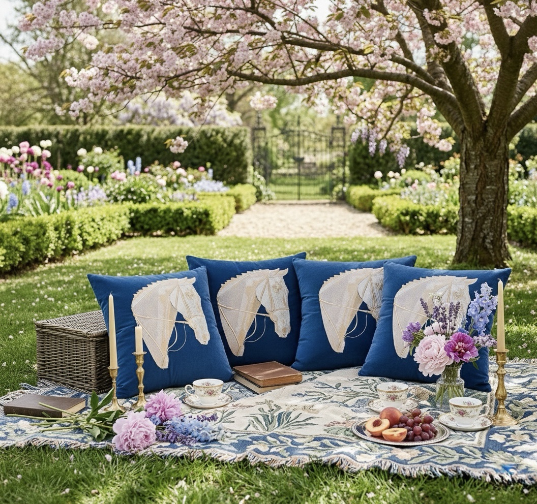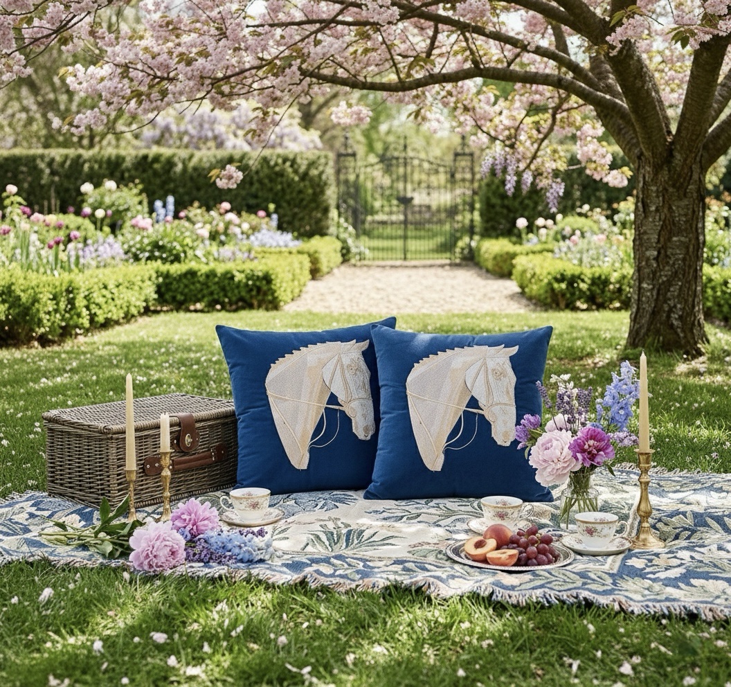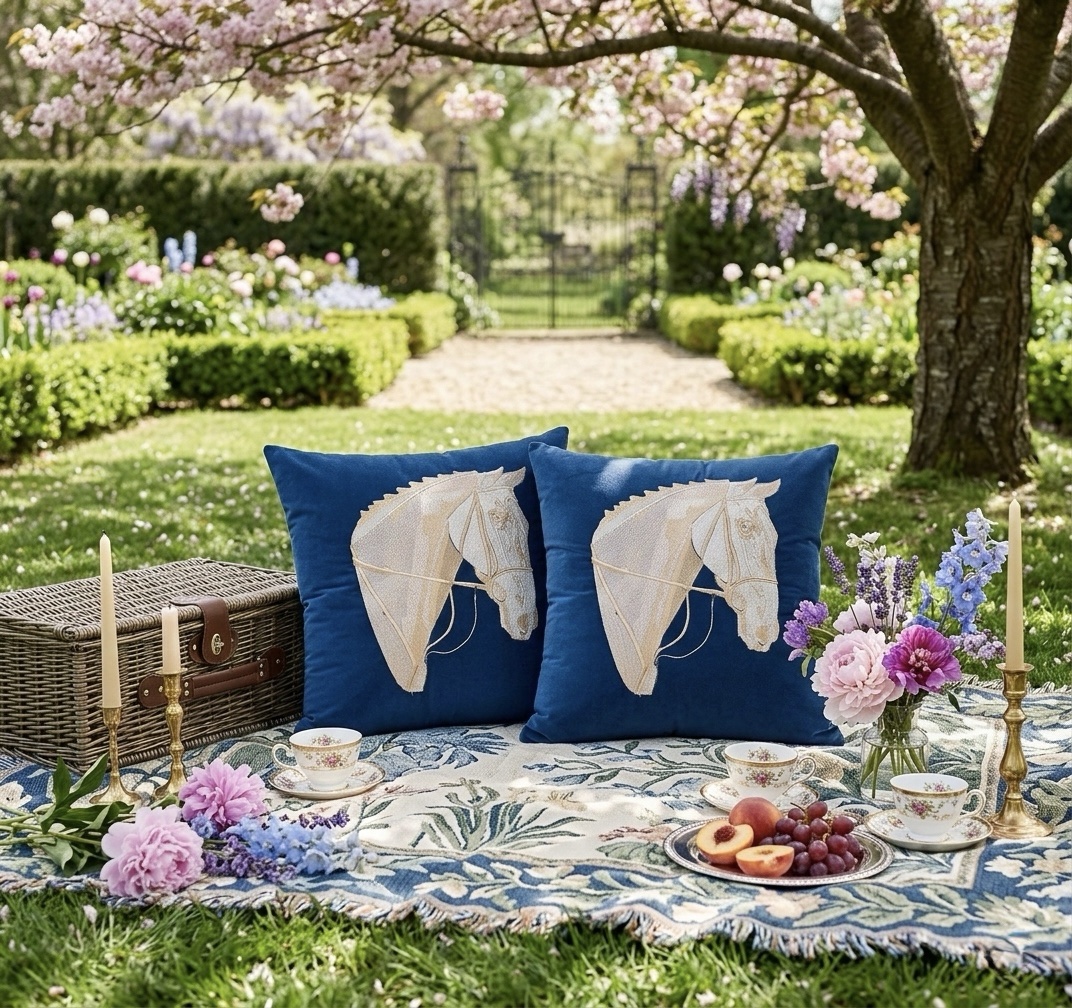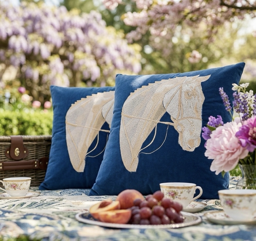 Designed for horse lovers and derby enthusiasts, this blue velvet cushion cover with a striking horse motif, equestrian-inspired luxury to any room.