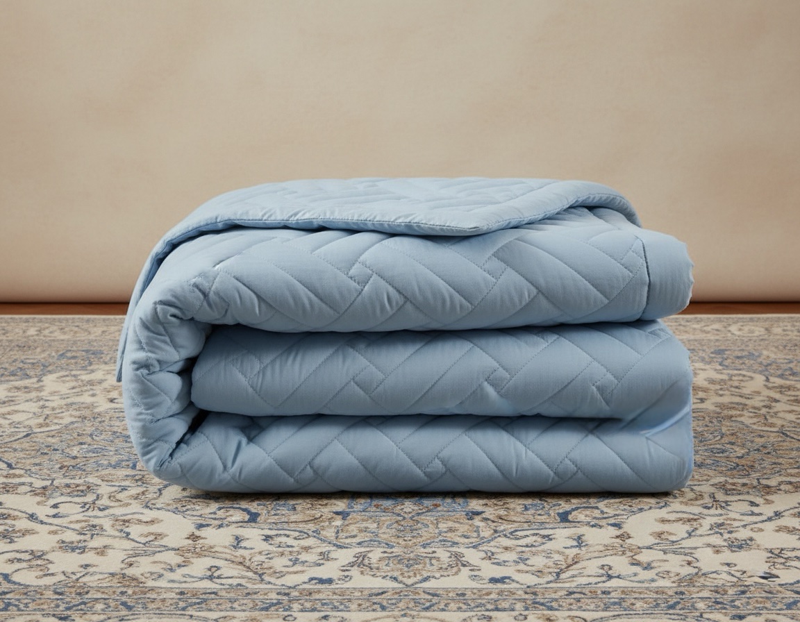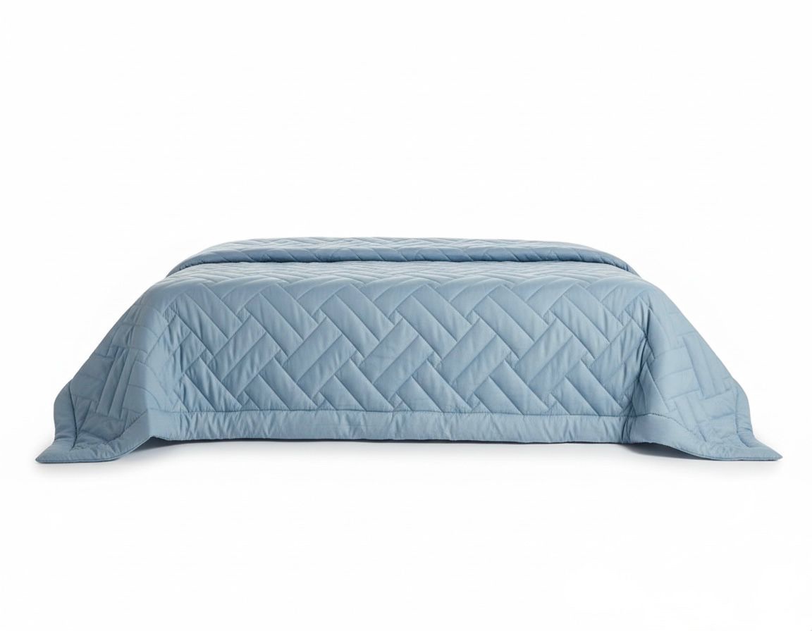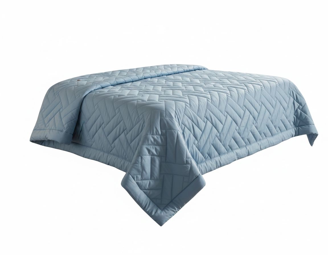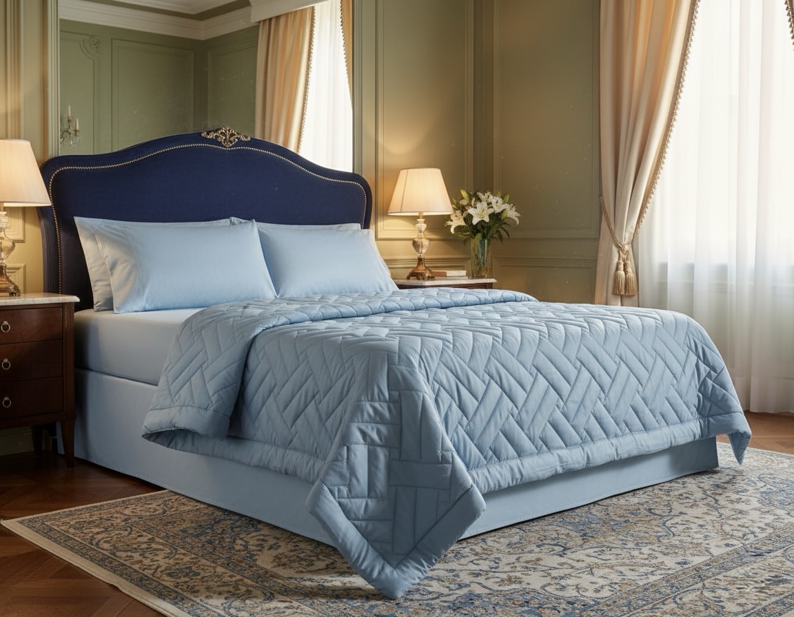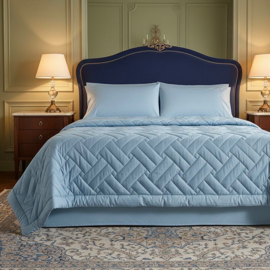 Made from 100% cotton with a 400 thread count sateen weave, this blue comforter features a Venetian arc stitching pattern for even fill and a smooth, breathable feel. Luxurious, lightweight, and perfect for year-round comfort.