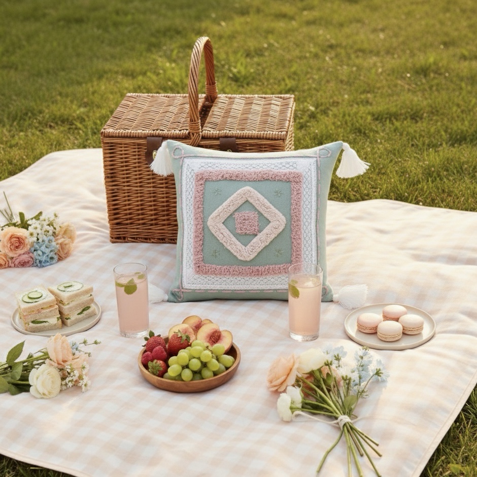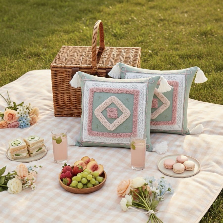 Be the first to review “Boho Tufted Embroidered Cushion Cover – Sage Green and Blush Pink with Tassels | 16” x 16””