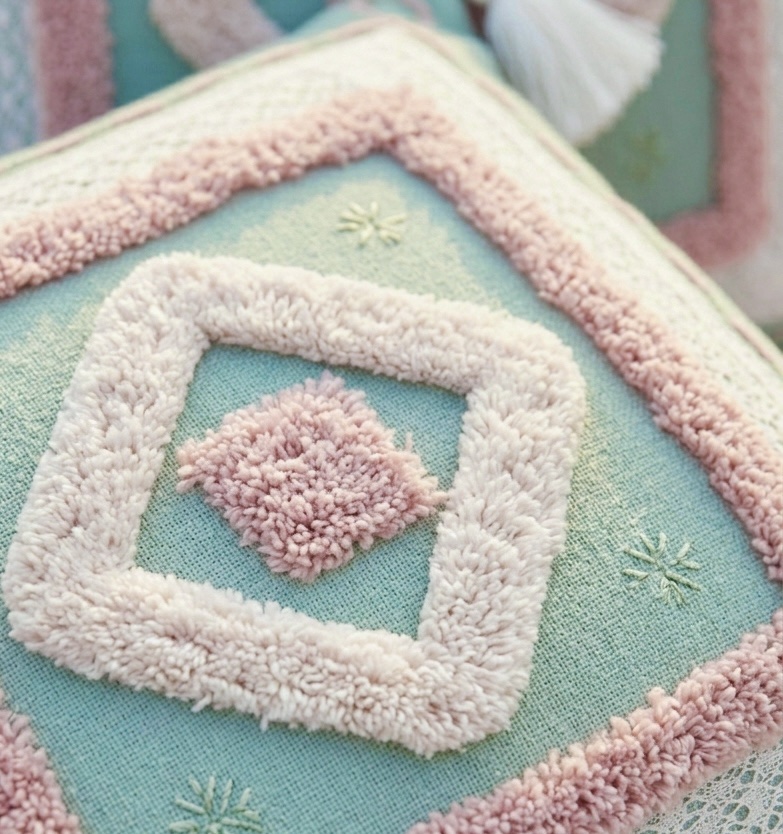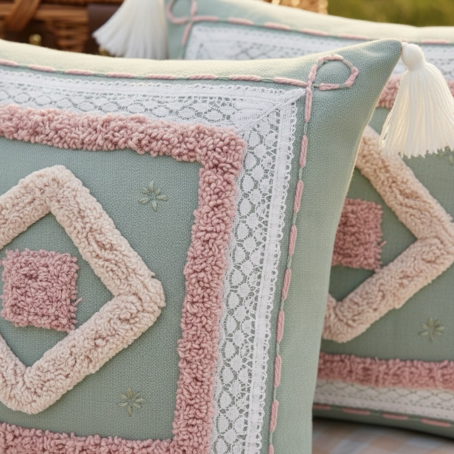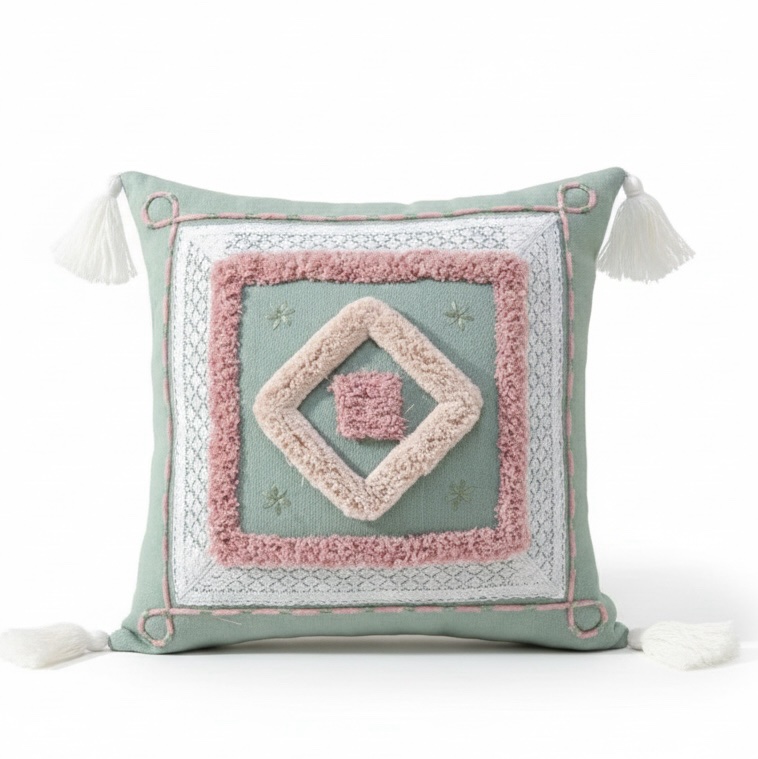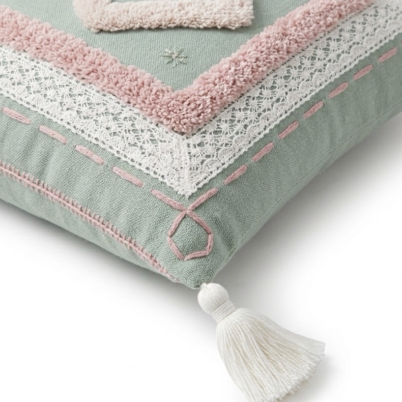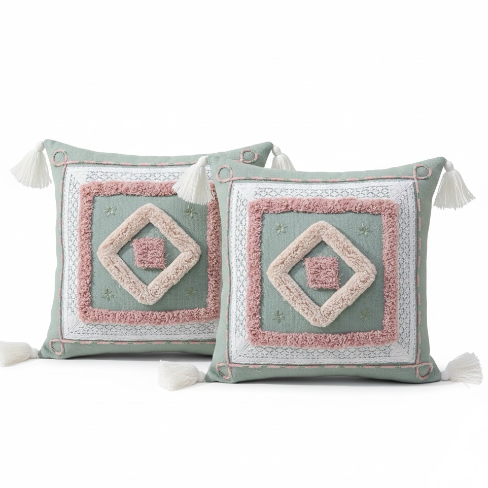 Boho Tufted Embroidered Cushion Cover – Sage Green and Blush Pink with Tassels | 16” x 16”