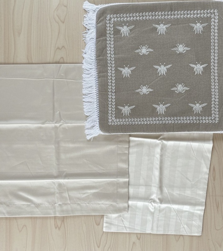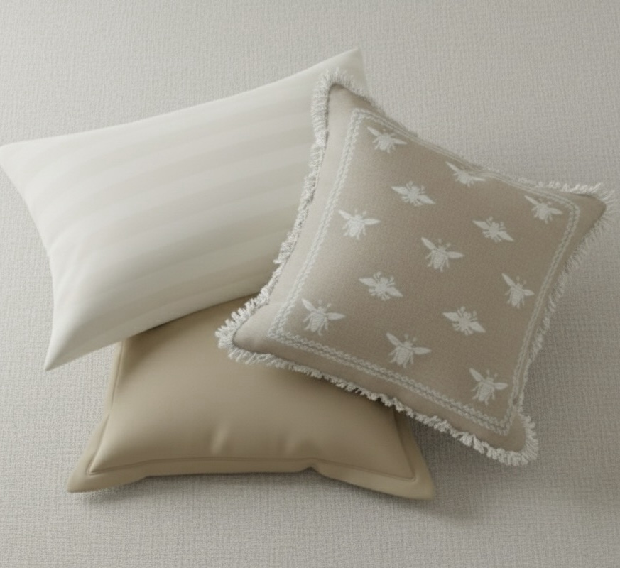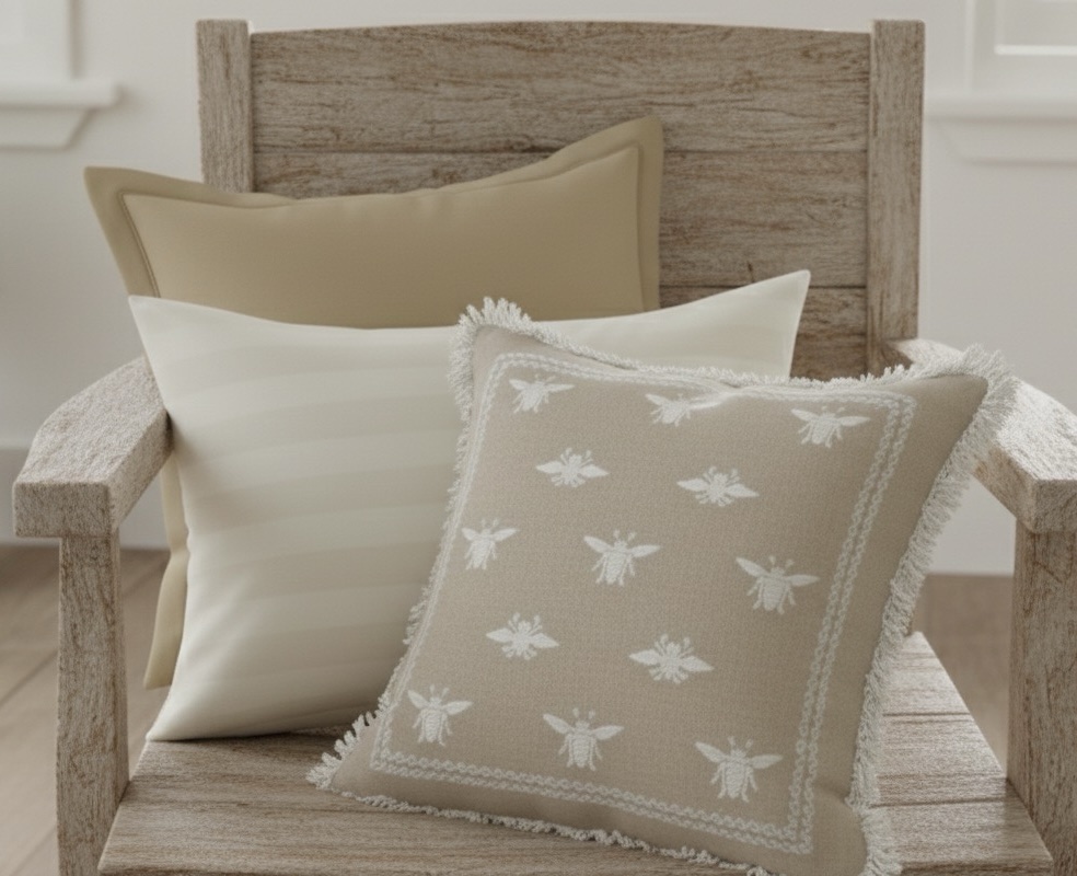 • 1 x Honey Bee Embroidered Cover (Approx. 16″ x 16″): A square, light beige/taupe cover featuring delicate, crisp white honey bee embroidery. Finished with a charming, textured tassel/fringe border, this piece adds an element of whimsical luxury.