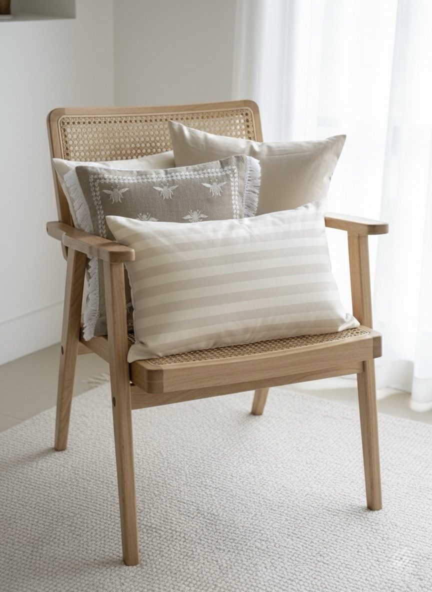 • 1 x Ivory Striped Lumbar Cover (Approx. 12″ x 20″): A rectangular (lumbar) cover in a creamy ivory shade. The soft, sateen-like fabric features subtle horizontal stripe detailing that catches the light, adding a refined, modern accent.