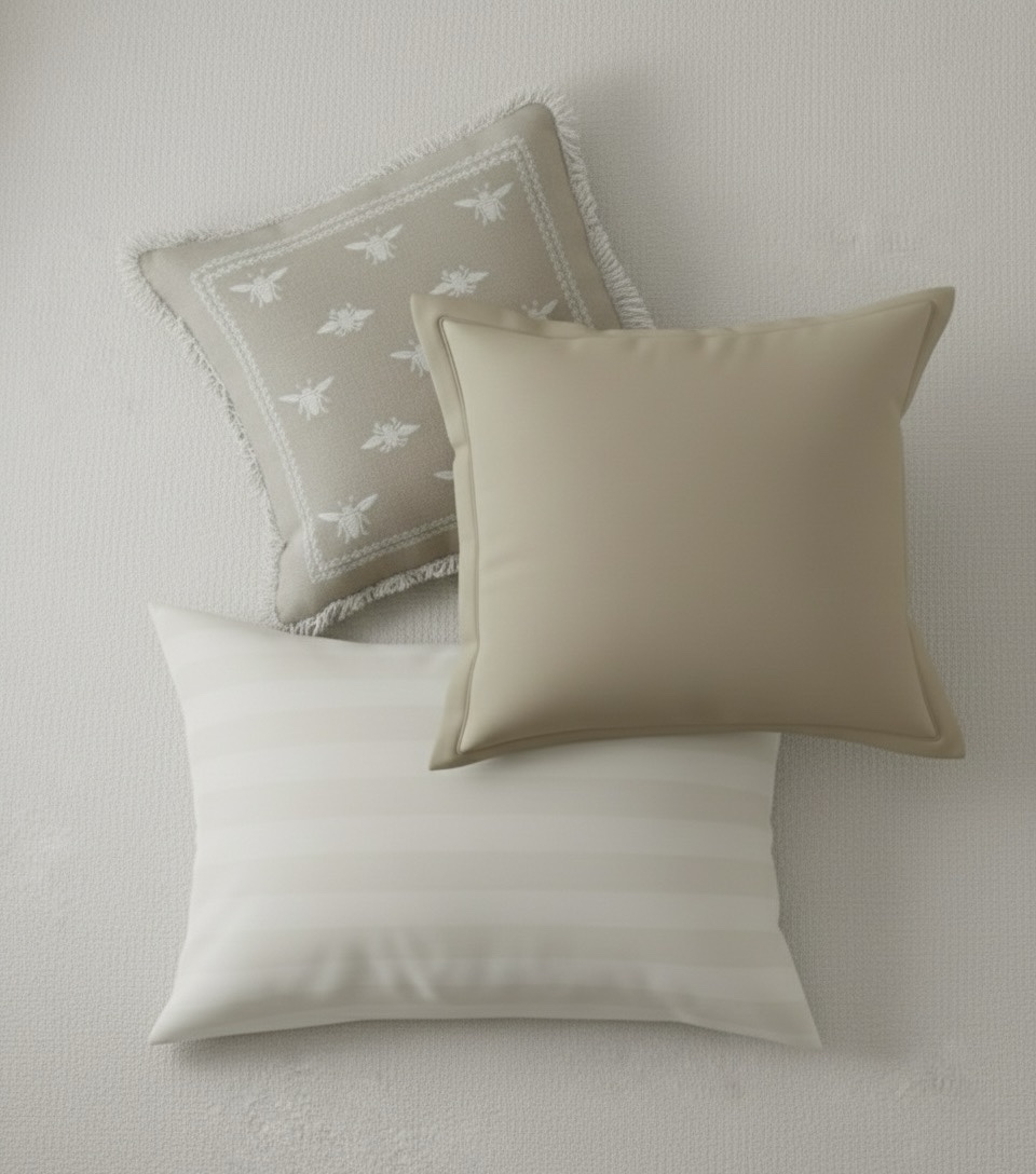 • 1 x Light Beige Solid Flange Cover (Approx. 16″ x 16″): A plain, subtly textured light beige square cover that serves as a beautiful grounding piece. The elegant wide flange border frames the cover, adding structure and a high-end, tailored finish.
