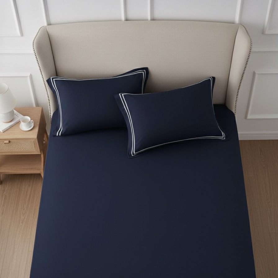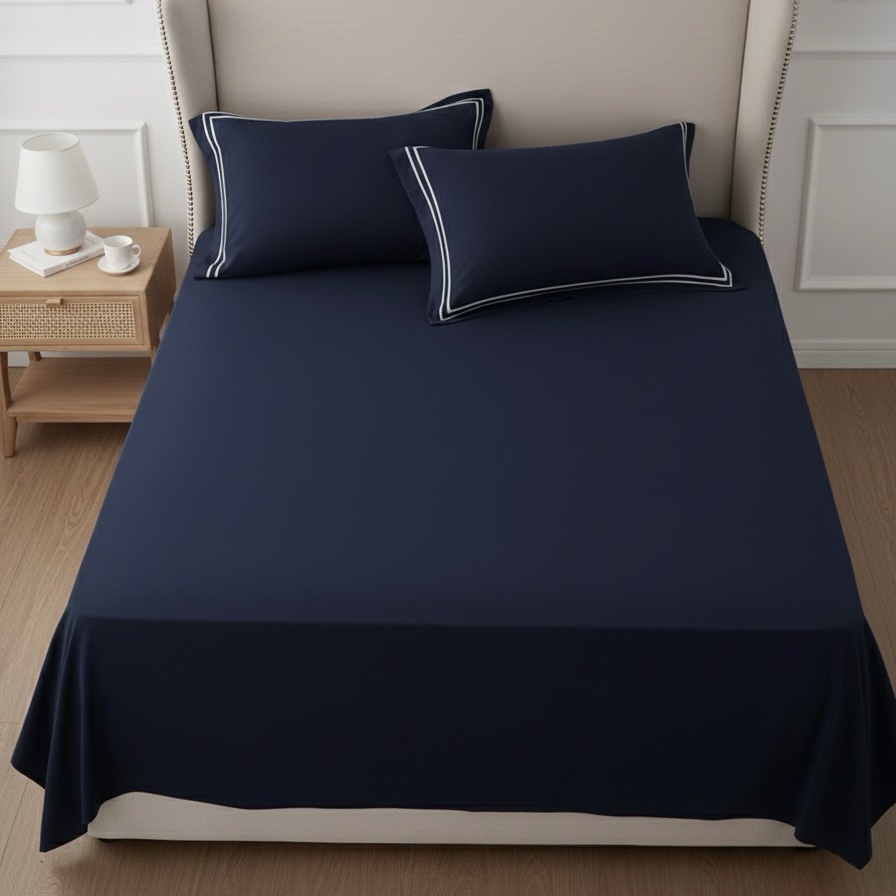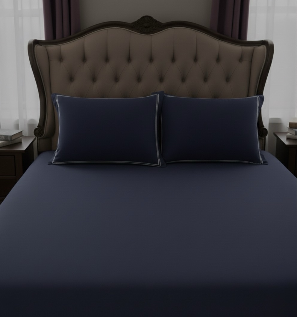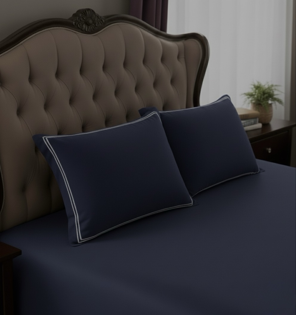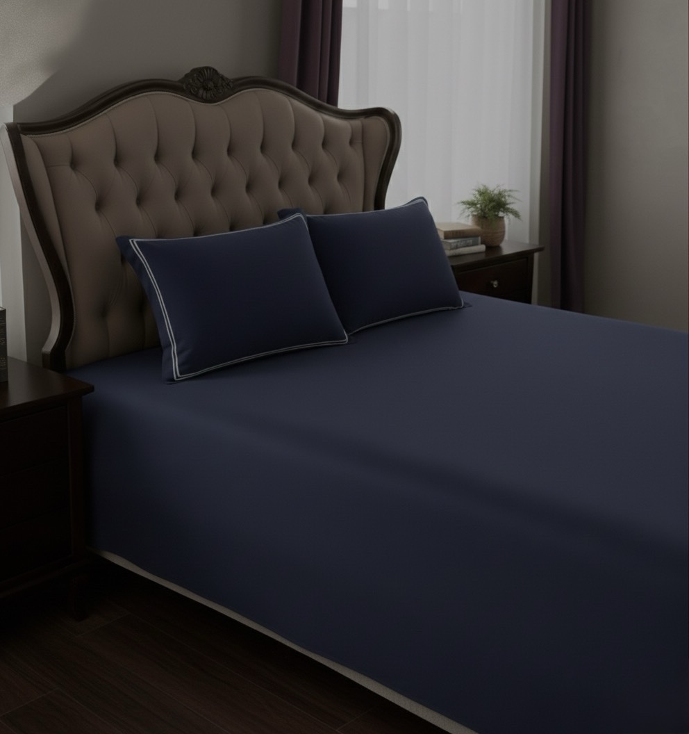 Premium Blue 600 TC bed sheet set with soft 100% cotton fabric and elegant double-merrow pillow covers. Smooth finish, long-lasting quality, perfect for modern bedrooms.