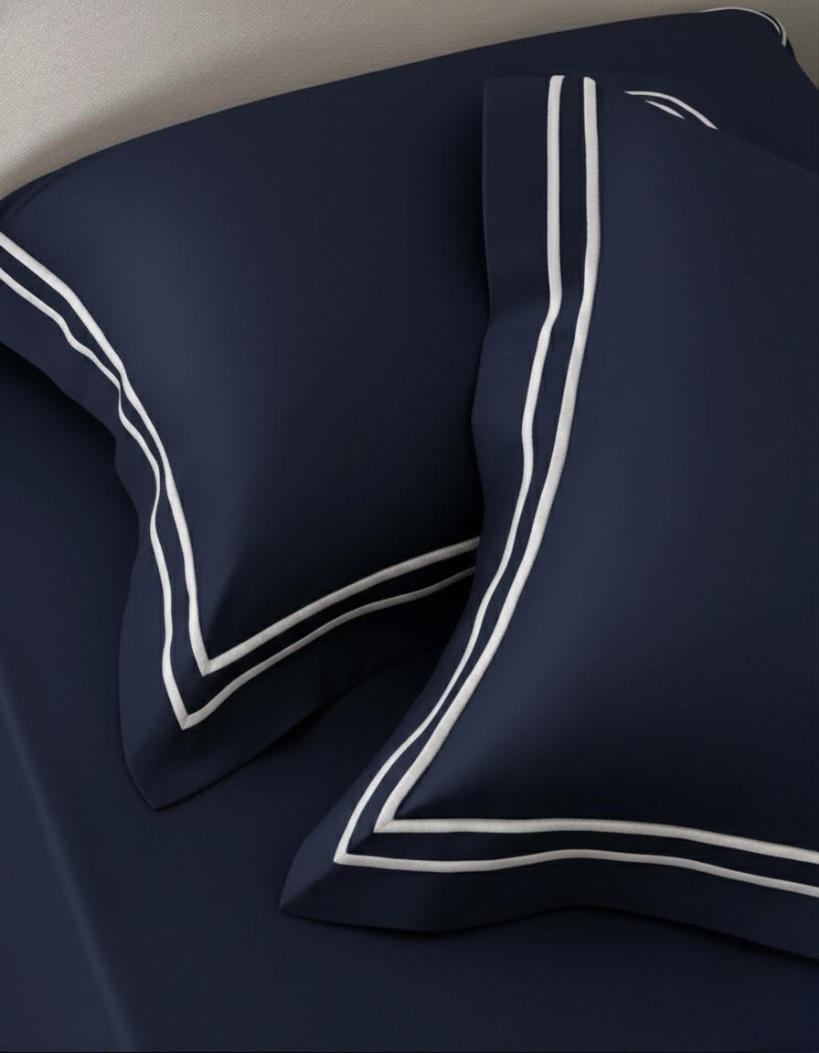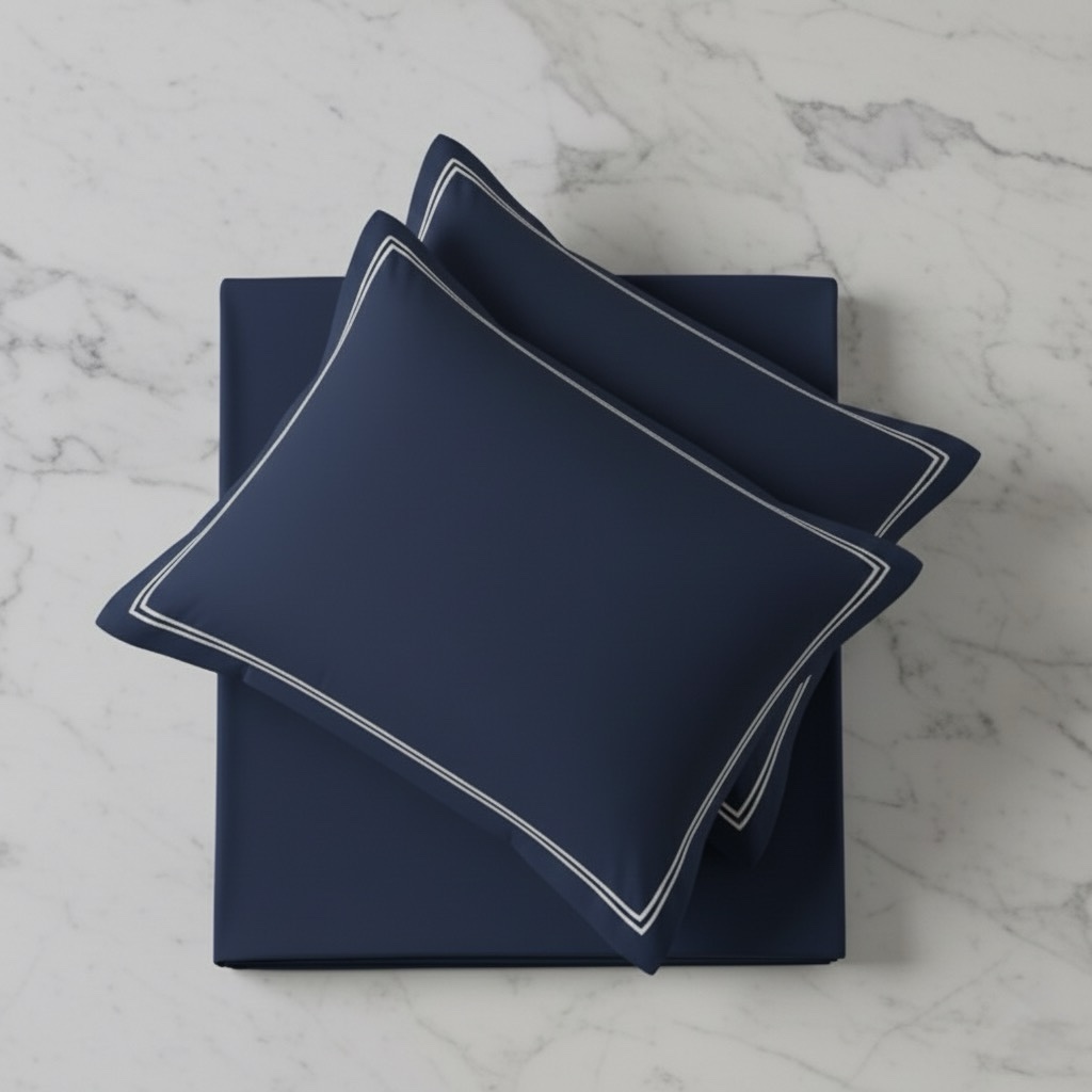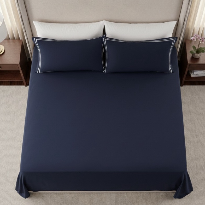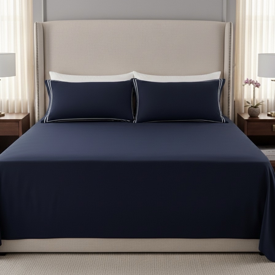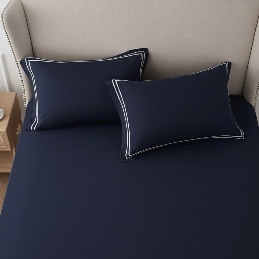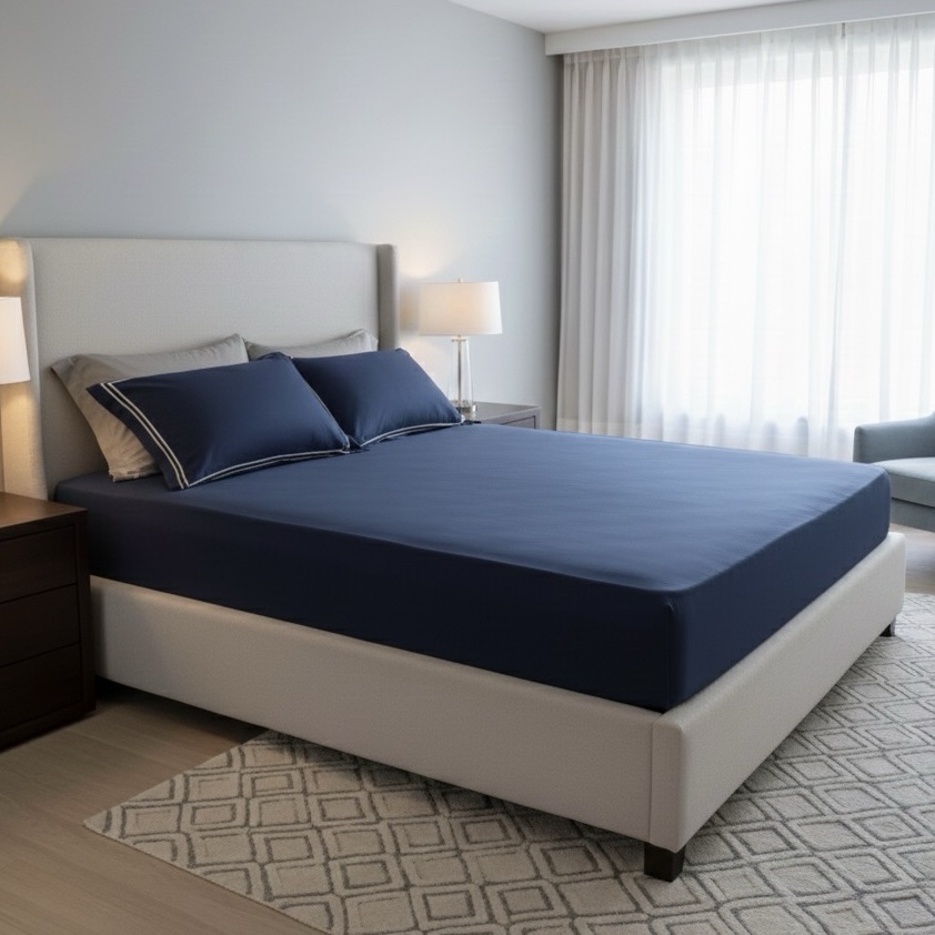 Premium Blue 600 TC bed sheet set with soft 100% cotton fabric and elegant double-merrow pillow covers. Smooth finish, long-lasting quality, perfect for modern bedrooms.