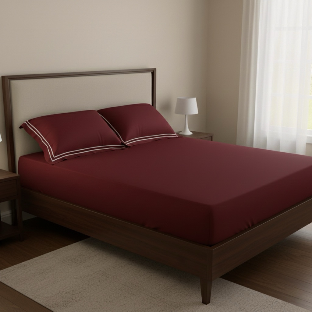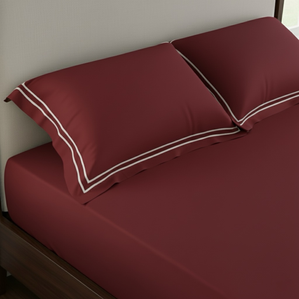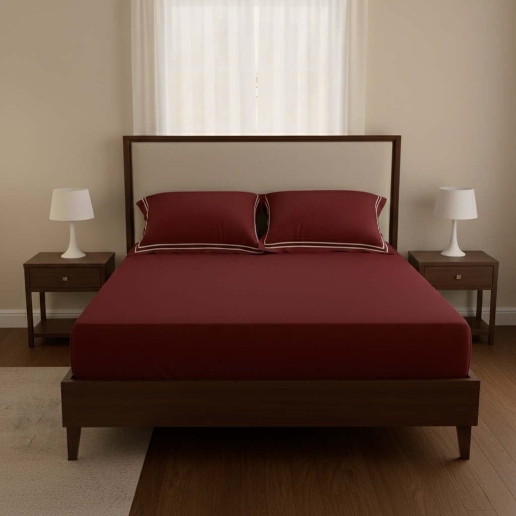 Premium 400 TC bed sheet set with soft 100% cotton fabric and elegant double-merrow pillow covers. Smooth finish, long-lasting quality, perfect for modern bedrooms. Pillow covers feature clean white stitched lines, while the bed sheet remains plain for a minimal, elegant look.