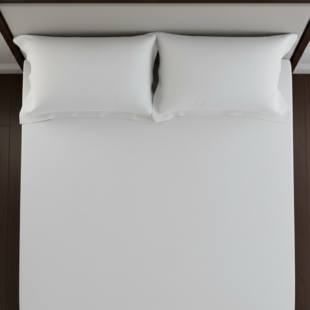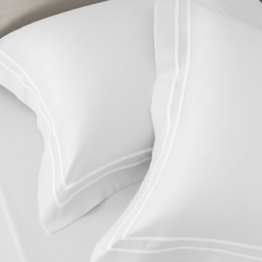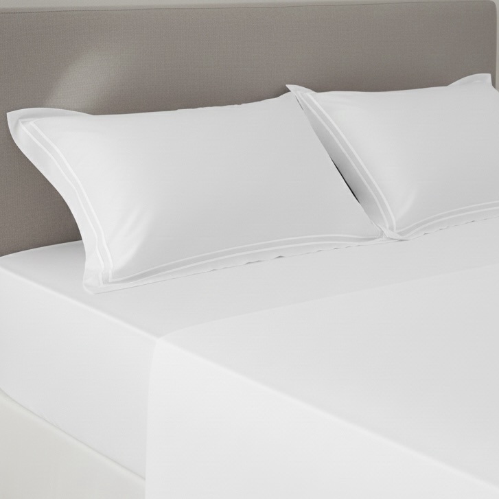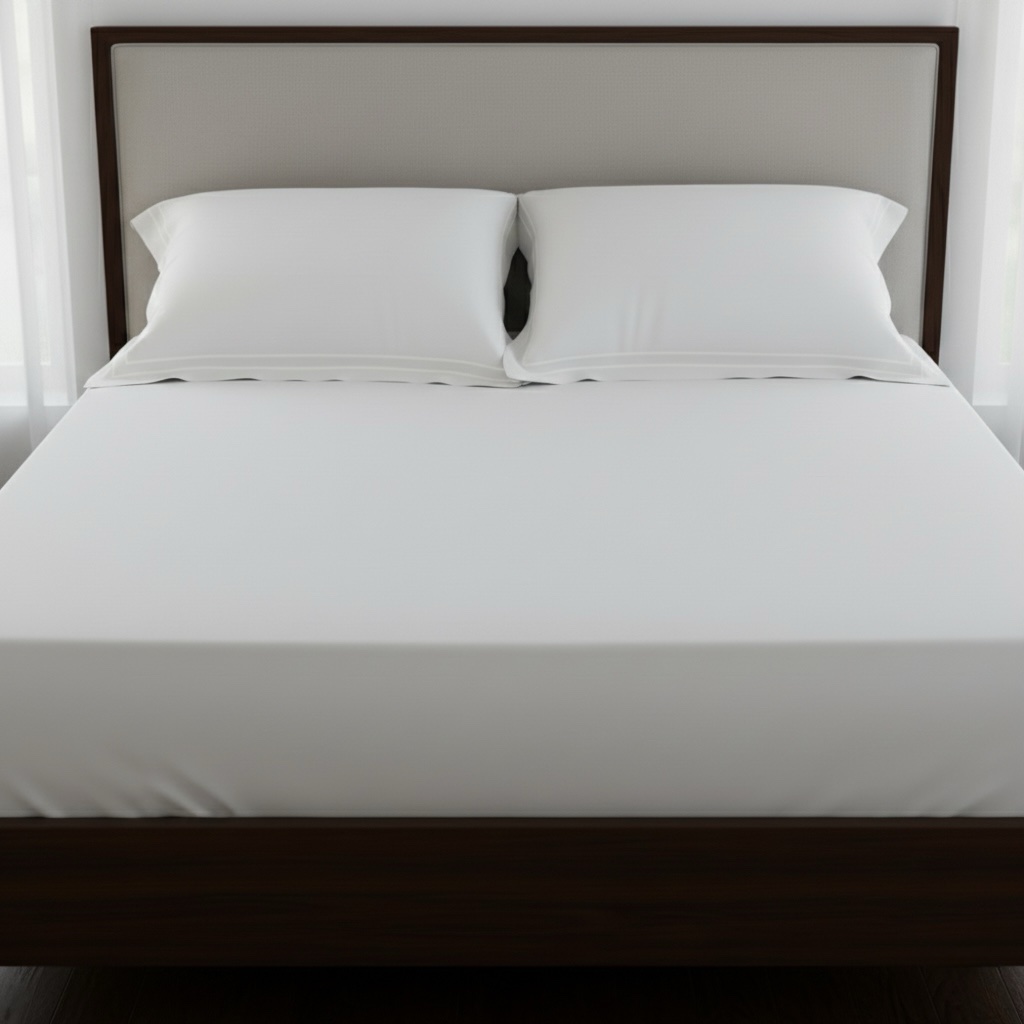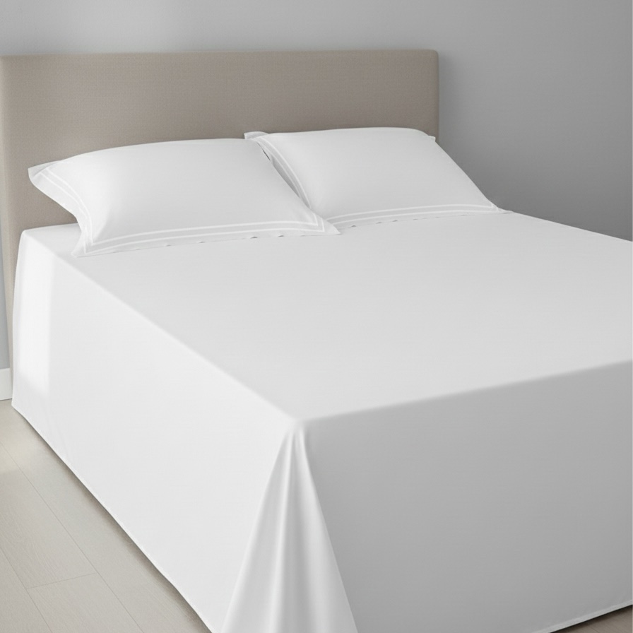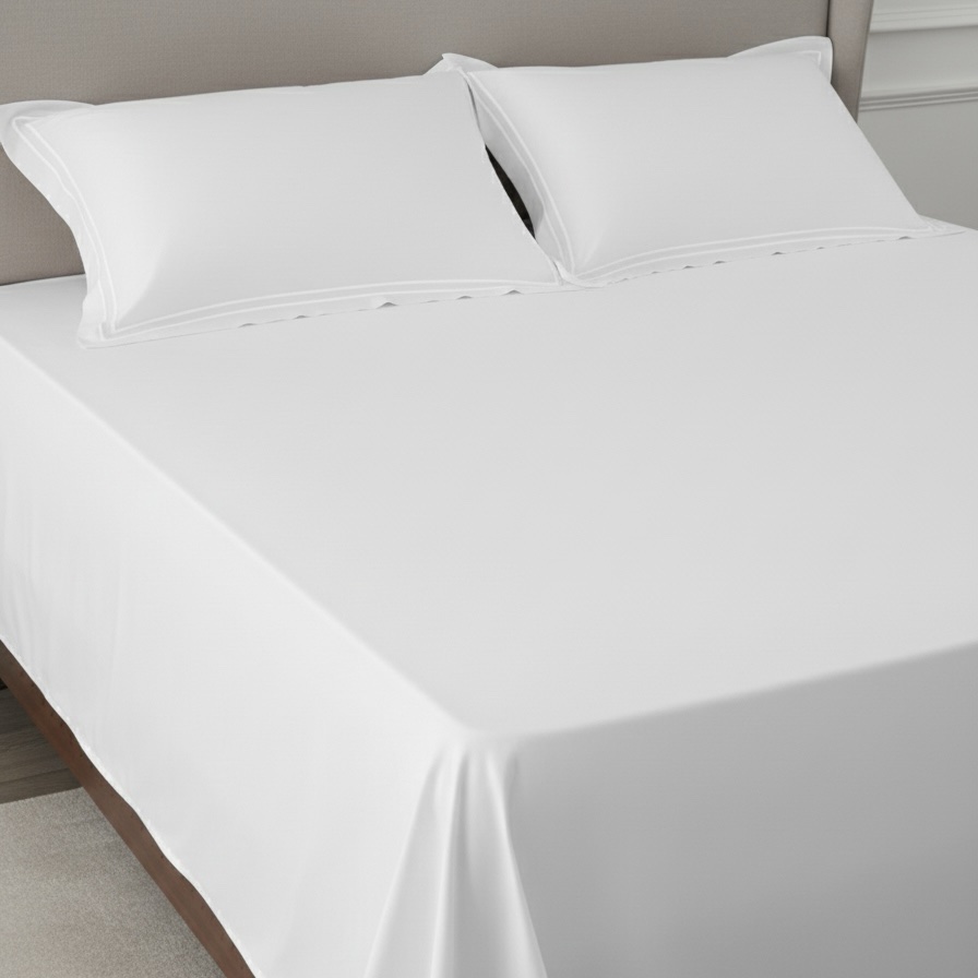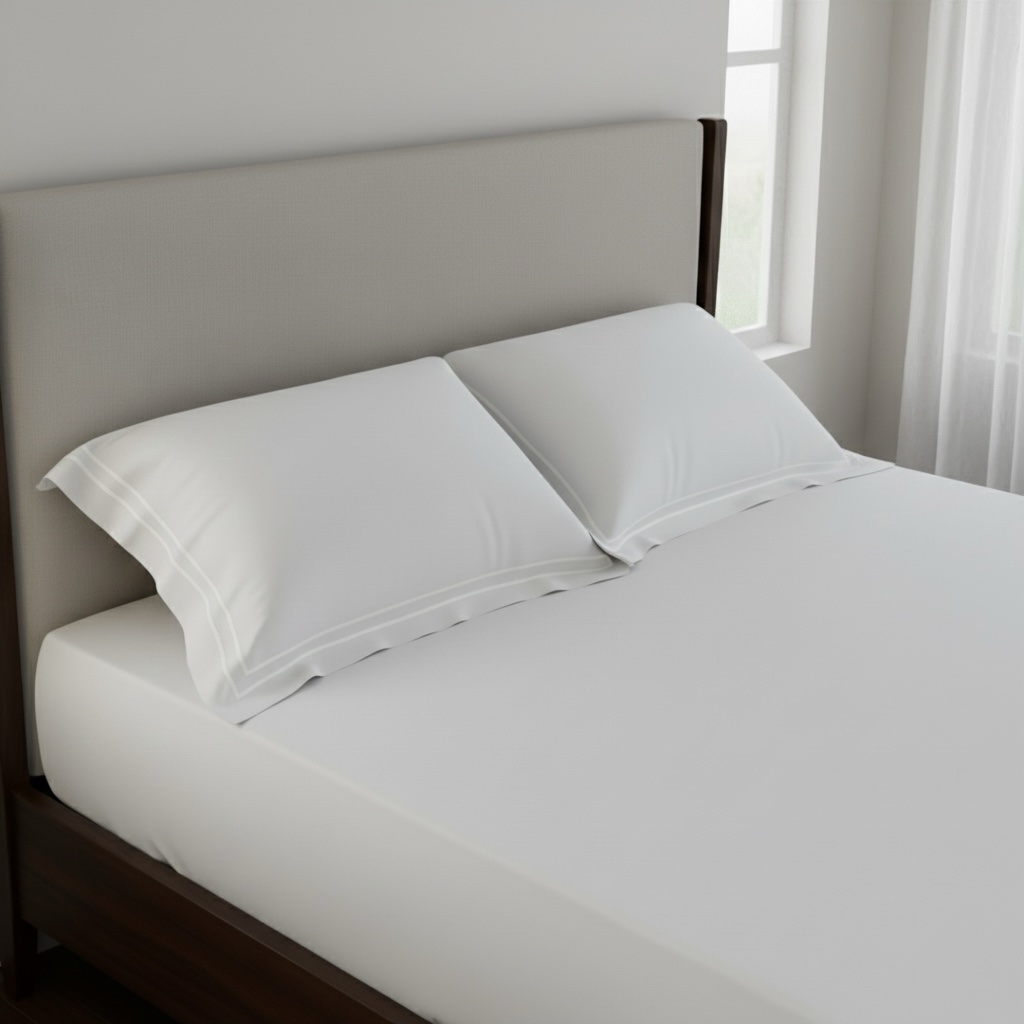 Premium white 400 TC bed sheet set with soft 100% cotton fabric and elegant double-merrow pillow covers. Smooth finish, long-lasting quality, perfect for modern bedrooms. Pillow covers feature clean white stitched lines, while the bed sheet remains plain for a minimal, elegant look.