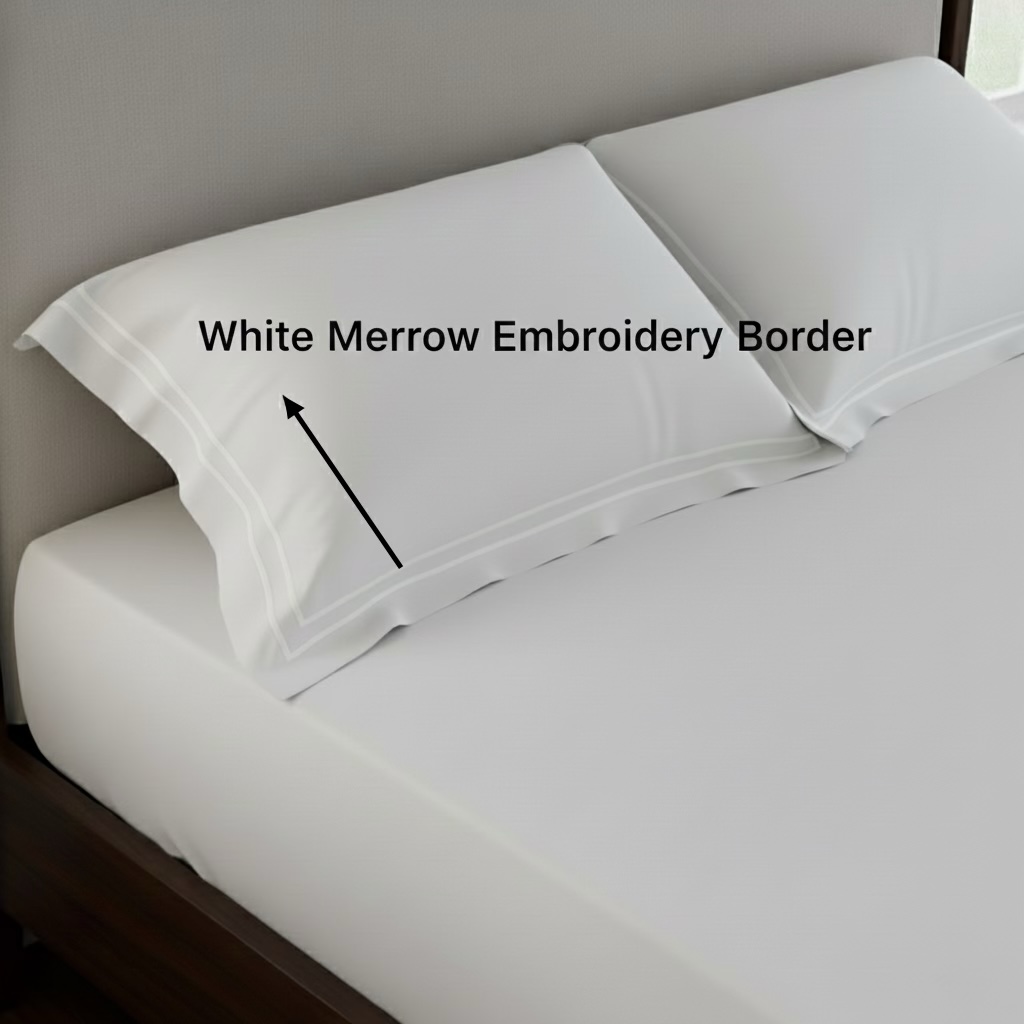 • White embroidery is on the pillow covers, not on the bed sheet.